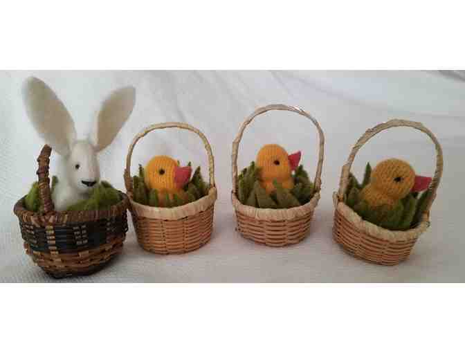 Just in time for Spring and Easter! Wool knitted white bunny and three chicks in baskets.