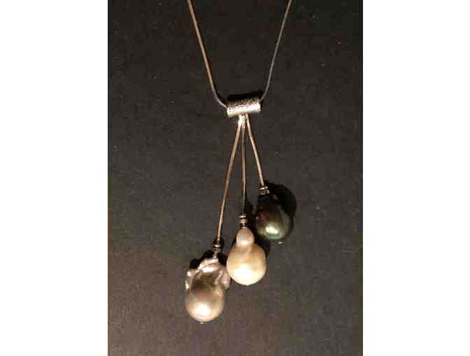 Silver necklace with three different colored Baroque pearls. The pearls hang 3" below the 16" chain.