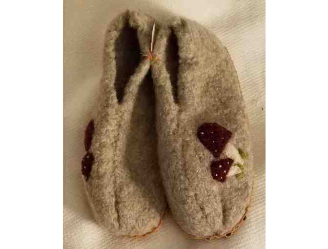Sweet handmade children's grey felted slippers with felted mushroom design and leather soles. Approximately 6 1/2" long, similar to US toddler size 9/10.
