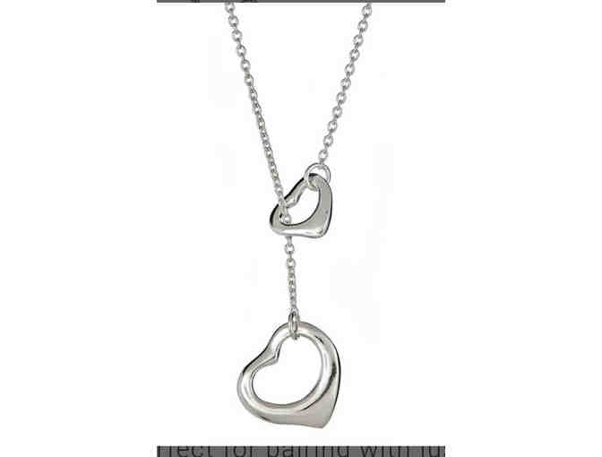 A perfect gift for any occasion! This is an 18" heart lariat necklace with .5" and .25" hearts. Spring Ring Clasp and comes in an elegant black pouch.