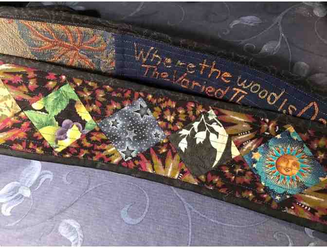 Here’s another handmade guitar strap fresh off my sewing machine. The phrase “Where the wood is darkest, the Varied Thrush will sing,” from the song “ The Golden Day is Dying” is embroidered on the reverse side.