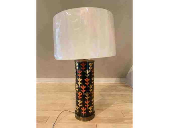 Black, Orange, and Gold Oil Painted Patterned Lamp with Antique Brass Base. Chinese. Porcelain.