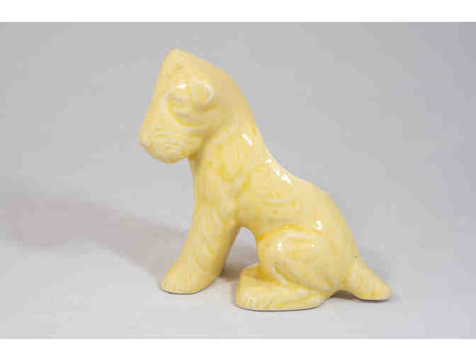 Attention Terrier Lovers! This ceramic dog is modeled after the loveable breed and is chock full of personality. This must-have item is a statue of a beautiful terrier and has been fired in a creamy yellow glaze. Perfect companion for your desk at work or home!