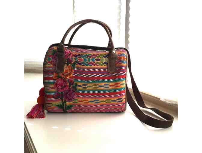The beautiful Guatemalan purse is 11" x 9" x 4" with gorgeous embroidery and leather handles and shoulder strap.