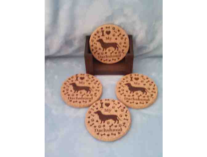"I Love My Dachshund" set of four cork coasters with holder. Coasters - 4" round x 3/8" thick Holder - walnut finish wood
