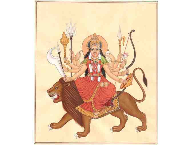 Original paper painting of Divine Mother on Lion done by Indian artist. The image measures 5.5" X 6.5". It is on a paper that is actually 6.5" X 7.75".