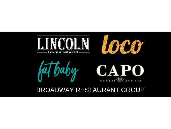 The $100 Gift Card can be used at Lincoln, Capo, Loco, or Fat Baby.