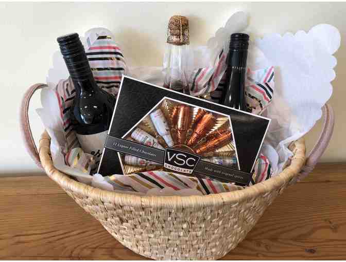 End your glass of wine on a sweet note with this assortment of wines and chocolates. This basket features three bottles of wine, including Esk Valley Merlot Cabernet Sauvignon Malbec (2011), Sofia Brut Rose (2016) and Kilikanoon Shiraz, (2014) and a box of 12 VSC liquor-filled chocolates, featuring Jim Beam Bourbon, Grand Marnier, Sauza Tequila and Remy Martin Champagne.