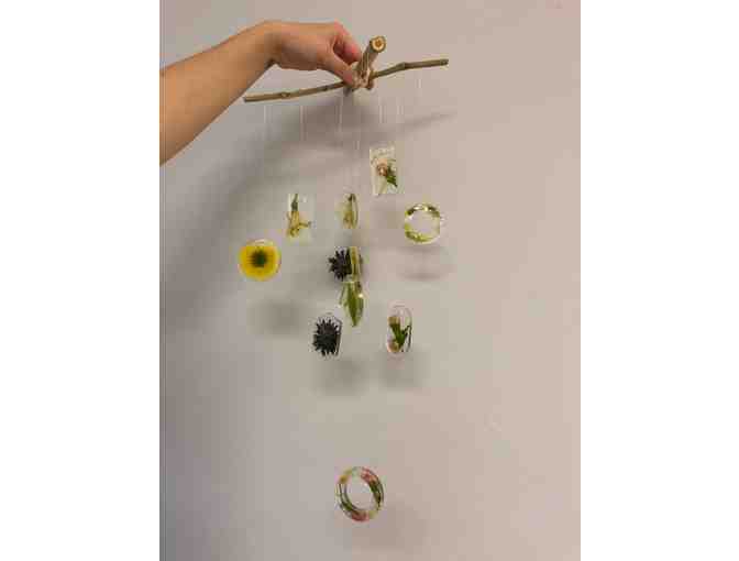 The children of Room 6 decorated a portable canvas tent by throwing balloons filled with paint on it, exploring the mixing of colors and working hard to throw balloons on it so they would pop. Then they used pine needles they found on the school's campus to use as bristles like on a brush to add another detail to the tent. Finally, after being introduced to and taught how to use a press, the children choose flowers to press and then placed them in resin shapes to form a beautiful mobile.