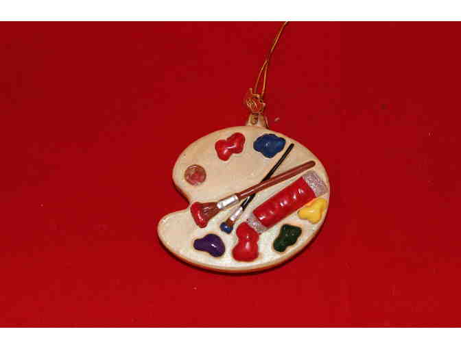 Ornament is beige palette with paint splotches and brushes in primary colors. Size 3" x 3 ½ ".  This collector’s item comes in its original box.