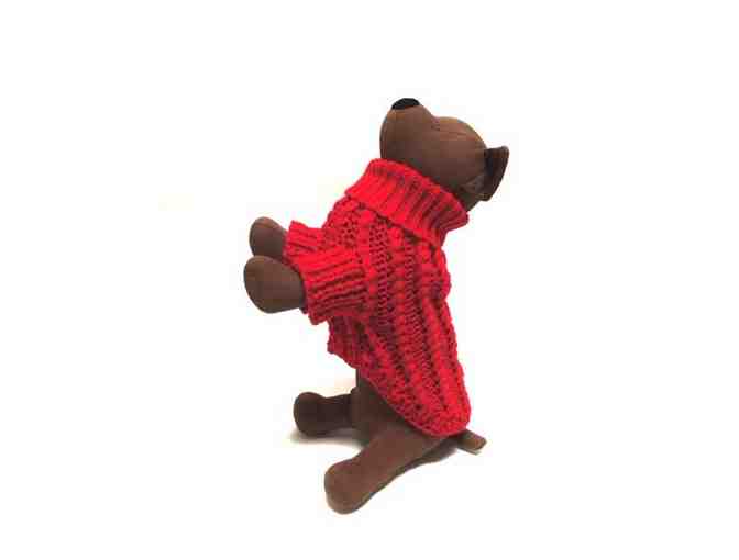 Make sure your 4-legged fur baby stays warm next winter. Zoomies' chunky, hand knit red cable turtleneck sweater is warm and cozy . Made from a soft, thick acrylic yarn that easily stretches, it features a hidden harness hole and front legs. Machine washable or hand wash in cold water and lay flat to dry.