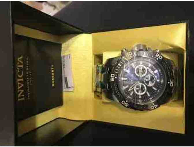 Stainless steel case with a stainless steel bracelet. Black ion-plated bezel with a black carbon fiber top ring. Blue dial with silver-tone skeleton hands and index / Arabic numeral hour markers. Minute markers around the outer rim. Dial Type: Analog. Luminescent hands and markers. Date display between 4 and 5 o'clock position. Chronograph - three sub-dials displaying: 60 second, 60 minute and 24 hour. Hattori caliber VD53 quartz movement. Scratch resistant flame fusion crystal. Pull / push crown. Solid case back. Round case shape. Case size: 51 mm. Case thickness: 13 mm. Band width: 26 mm. Fold over clasp. Water resistant at 100 meters / 330 feet. Functions: chronograph, date, GMT, second time zone, hour, minute, second. Sport watch style. Watch label: Japan Movt. Invicta Pro Diver Chronograph Blue Dial Mens Watch 25779.