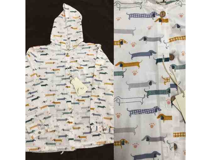 white hooded button shirt covered in doxies..100% cotton. drawstring bottom. Size Small?medium