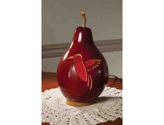 This is a *retired* piece from Meadowbrooke Gourds in Carlisle, PA! This would make a wonderful nightlight or a piece to grace a side table where illumination is needed. The gourd stands 8.5" high and is approximately 5" wide. Perfect condition! Light works.