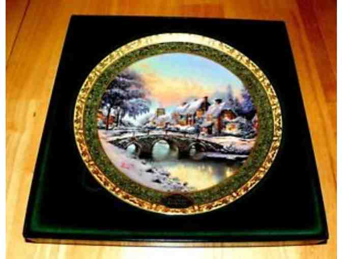 A beautiful plate from artist Thomas Kinkade. Entitled Cobblestone Christmas, it's the seventh issue in the Cherished Christmas Memories collection and the official 2005 annual edition. Produced in a limited edition to the year of issue. It is 9 1/4" wide.
