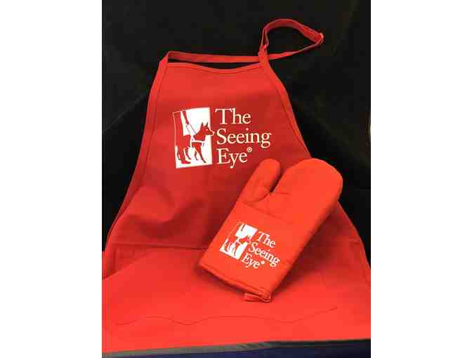 Perfect for any chef this apron and oven mitt are red with The Seeing Eye logo emblazoned in white. The bib apron has two pockets on the front to hold your cooking essentials.