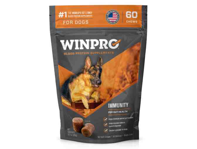 WINPRO Immunity “contains a blend of animal blood proteins and other key ingredients to help dogs combat the negative effects of stress and inflammation. WINPRO Immunity is specifically formulated to help boost your dog's defense against things that can undermine its immune system. By promoting a healthy gut, WINPRO Immunity helps dogs of all ages — especially during times of travel, stress, competition, etc.”
