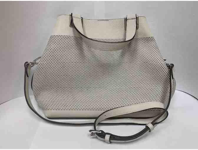 This cheerful yet classy putty-colored leather shoulder bag features perforations on the sides that give the illusion of mesh. Outfitted with three generously sized interior pockets, this bag is deceptively large and fits everything that you need while being effortlessly stylish.
