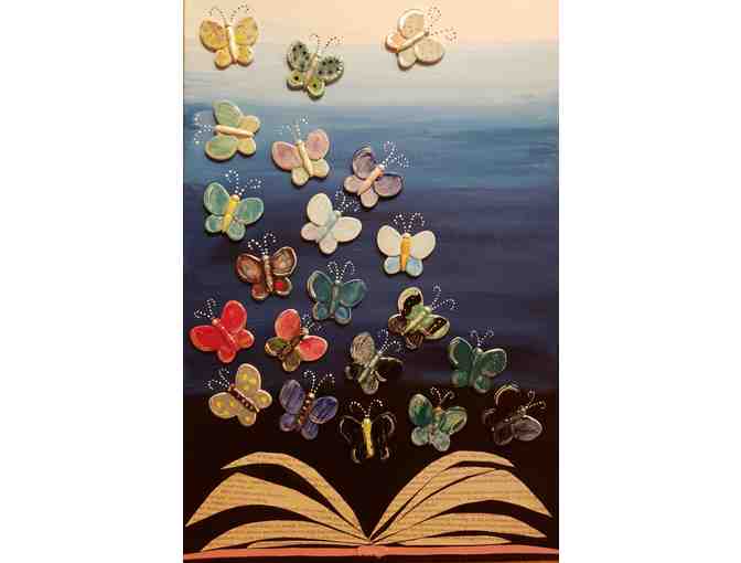 Mixed media artwork with twenty ceramic butterflies emerging from a book to inspire your home,work, garden (or to donate to an SI classroom).