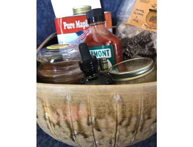 Chaga Moon tinctures (2); Vermont Barrel aged hot sauce; Skinner Hollow Farm Maple Syrup; Heleba Potatoes gift certificate ($20); Nicholas Seidner planter; Trifolium Farms honey; Mountain View Bison Jerky (2); Flower Brook Meadows gift certificate ($10): West River Creamery ($20).