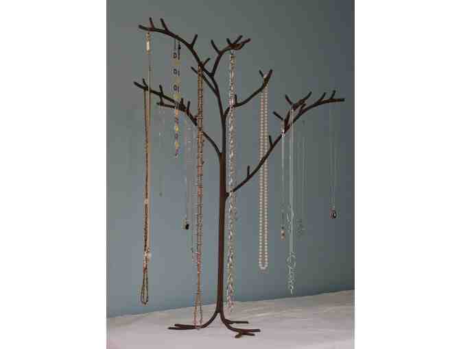 The jewelry tree was custom made from steel rods and painted with textured paint. At 25 inches high, this tree holds about 35 necklaces in perfect order and displays them in a lovely manner. Don't wear necklaces? Why not use the metal tree to display a collection of Easter eggs, tiny Christmas ornaments, small photographs, charms, metals or other small collectibles instead? Imagine how unique your table centerpiece would be with your collection displayed on this handcrafted tree? Treet yourself.
