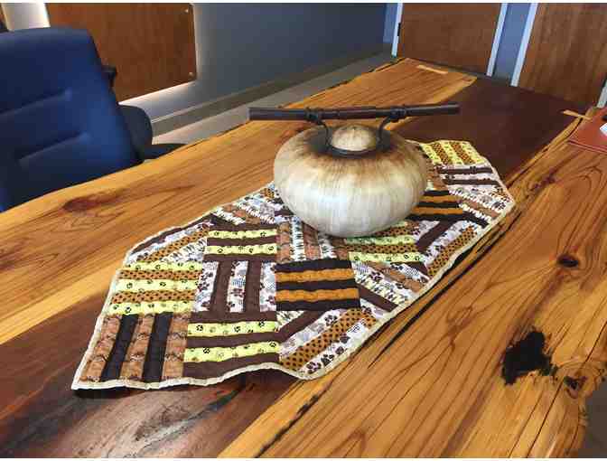 This "Bone Appetite" quilted table runner is 20" x 48" and hand-quilted by Karla J. Myers.  There are eight different prints forming a stripe pattern in browns, tans and yellow.  Two of the prints feature paw prints while the others are a mix of geometric patterns and polka dots.  The quilt has a cream backing and is signed and dated.