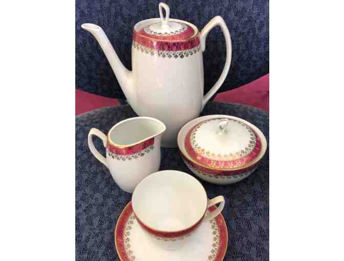 Coffee Set including six cups and saucers, coffee pot, lidded sugar, and handled creamer. Decoration is transfer-printed in tones of pink and gold.