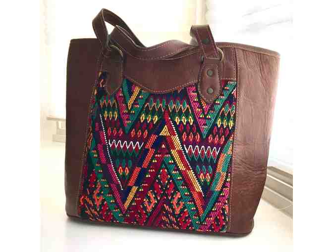 Brown Leather Tote with Guatemalan weaving on sides - Green/Orange/Pink