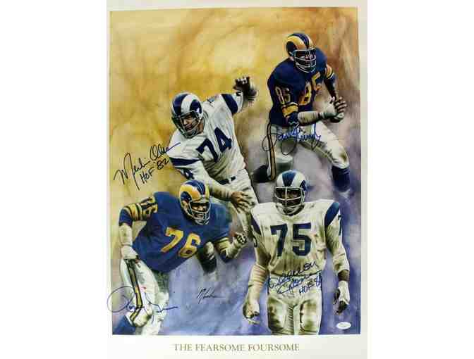 L.A. Rams Fearsome Foursome Signed Portrait in mint condition! This is a 29" x 36" L.A. Rams Fearsome Foursome art Lithograph. Features Deacon Jones (Rams HOF, D 2013), Lamar Lundy (D 2007), Rosey Grier, Merlin Olsen (Rams HOF, D 2010). Inscriptions include "HOF 82" by Merlin Olsen and "HOF 80" by Deacon Jones. In a wood gold leaf frame with white linen and Rams' blue gross grain matte. Personally given to the VanDeWeghes by Rosey Grier, who happened to be the preacher who married them in '95.