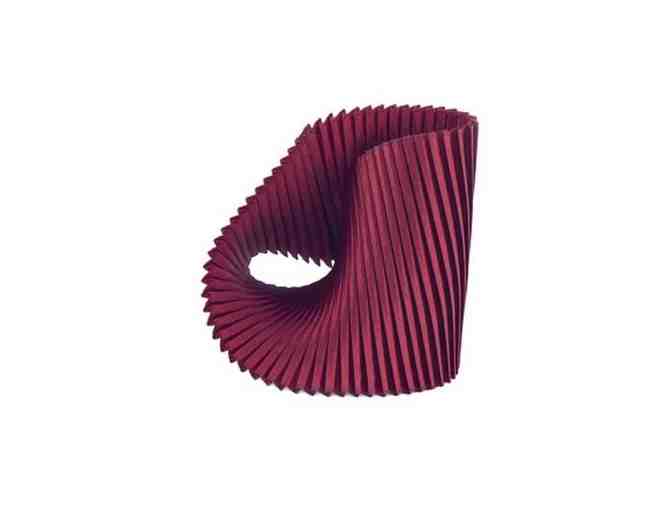A single piece of pleated fabric in Bordeaux winds its way around the wrist in a Mobius-like fashion, creating a sculptural statement for all to see. With a bit of stretch, the one-size-fits-all works for everyone.