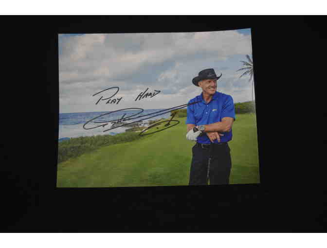 Professional Golfer, Greg Norman, has graciously autographed a photo entitled “Play Hard". The autograph is in black marker with the words "Play Hard" above and a drawing of a hole with flag below. This photo of Norman with a concentrated effort of body, mind, and spirit shows Norman in a relaxed pose wearing a blue shirt with shark insignia from the Greg Norman Collection. He's also sporting his own black Signature Straw Hat. The setting is a lush, green golf course under a brilliant blue sky. This Greg Norman photo should be an inspiration for any golfer as well as a reminder to “Play Hard" every day!