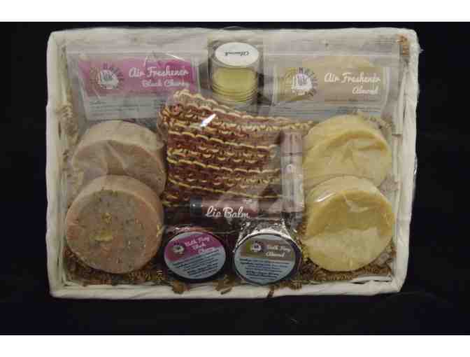 Whether you need a perfect gift for a friend or a secret indulgence for yourself, this basket of all-natural soaps and toiletries might be just what you’re looking for! All of the items are homemade, using all natural ingredients. Many of the soaps contain organic whole milk which improves the way they feel on your skin. What you won't find are preservatives, detergents or dyes. The assortment includes a bath soak, a soap stand, a handmade washcloth, an intriguing mix of soaps (both small & large), lotion bars, lip balms and more…each with a welcoming scent that will have you dreaming of your next opportunity to use them!
