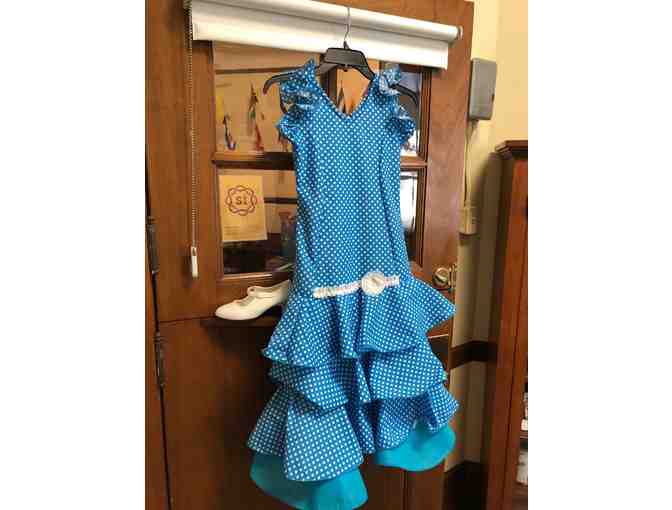 Your flamenquita will love this outfit which is directly from Spain. The dress is turquoise with white polka dots and the accompanying hair flowers, shawl and shoes are white. The dress is size 10 and the shoes are European size 30. Let your flamenquita shine at Step Up Day.