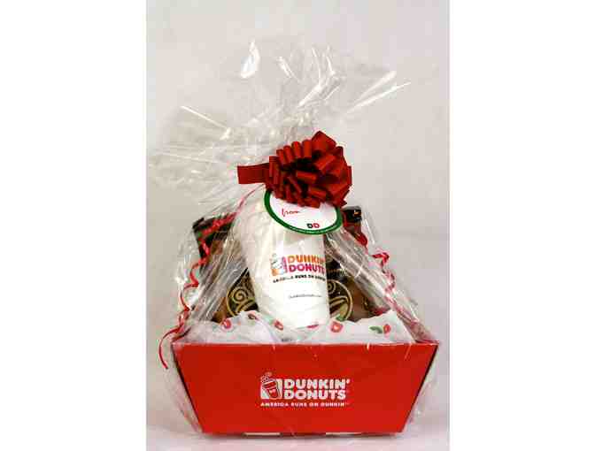 Dunkin' Donuts gift basket that contains 2 one pound bags of ground 100% Arabica, original blend coffee and a reusable travel cup.