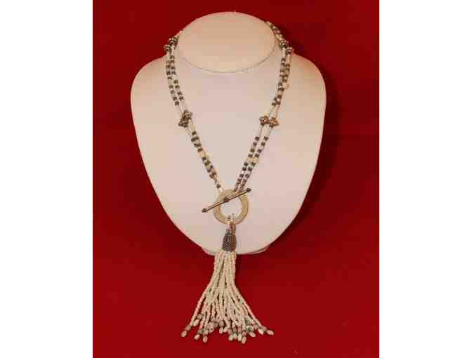 Stylish White and Silver Beaded Necklace with Drop Tassel