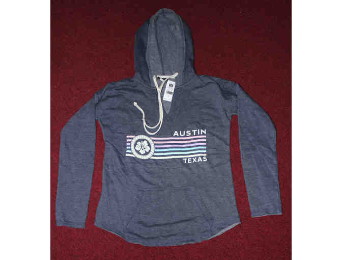Pullover hoodie with kangaroo front pocket, v-neck - Hibiscus Badge with pastel stripes, pink, blue, white