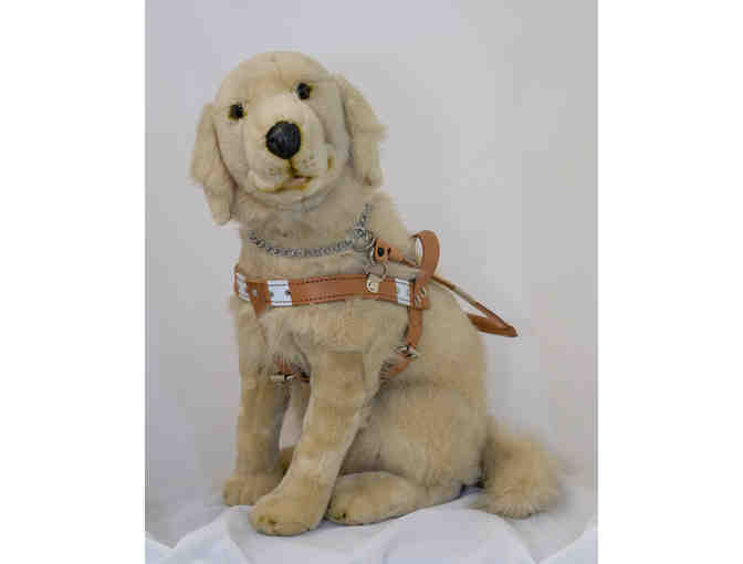 Welcome this delightful golden retriever plush dog into your life and he will bring you joy for years to come. "Chase," who is sitting with his toy leather harness, is a stunning replica of our dedicated working goldens here at The Seeing Eye. His adorable face and fluffy softness makes him a hugable, lovable companion for you!