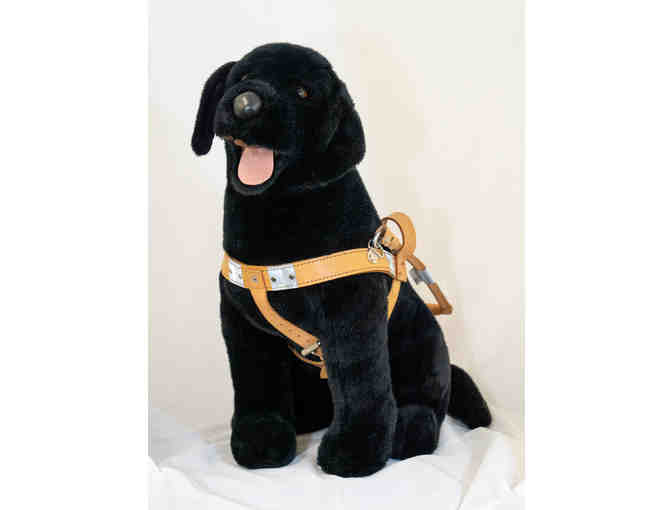 Sitting up and ready for work, our radiant, plush black Labrador retriever "Spinner" is simply an irresistible stuffed animal. Her handmade toy leather harness tells you she is a working dog and her dog tag proudly displays her name. Spinner is waiting for you to take her home!