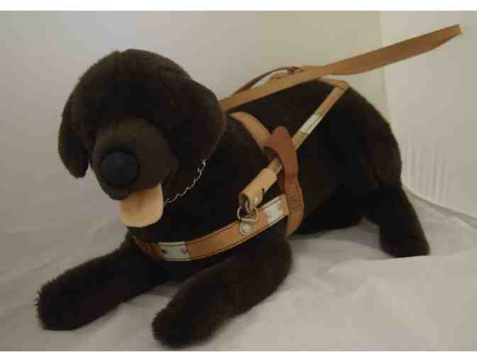 Resting on all four legs after a day's work, our radiant plush chocolate Labrador retriever "Hershey" is simply an irresistible stuffed animal. Her handmade toy leather harness and leash tells you she is a working dog. Hershey is waiting for you to take her home!