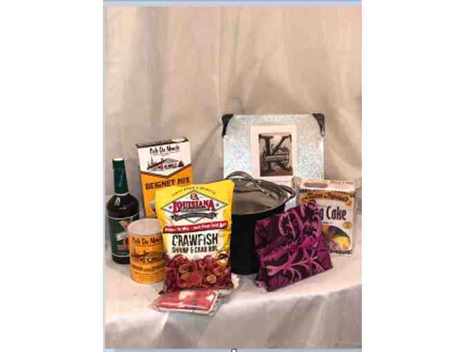 Taste of NOLA -Custom Cutting Board, Pat O'Brien's Hurrican Cocktail Mix, Mama Papaul's King Cake Mix, Café DuMonde Beignet Mix, Café DuMonde Coffee & Chicory, Louisiana Crawfish Shrimp & Crab Boil & 25 Lobster Bibs