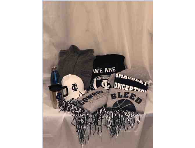 Gray Fleece Zip Up (2XL),Navy "We are IC" Sweatshirt (2XL), Gray Cowboy Pride T-Shirt, Gray Long Sleeve Basket T-Shirt ( 2XL), Navy Blue -Shirt (2XL), White Hat, Water Bottle & Travel Mug