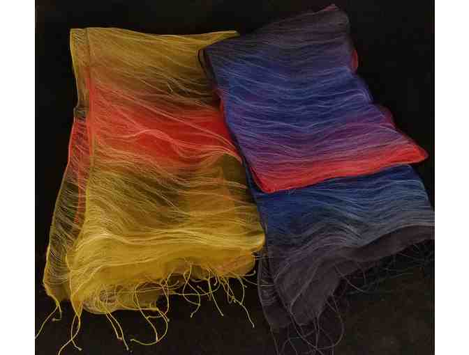 Dress up any outfit with one of these two elegant silk scarves. Each scarf measures 5½’ long and is intricately handcrafted from the heart and hands of skilled artisans. Beautiful silk filaments shimmer between mesh to give the illusion of silk threads floating through air. One scarf has bands of vibrant red to purple to brilliant blue to dark navy and the other scarf has bands of cream to earthy green to shimmering coral. Thin hand knotted tassels finish off each end of the scarves. Hand woven and hand-dyed silk scarves are traditionally worn by people as a symbol of royalty…what a fashion statement you will make with these one-of-a-kind scarves!