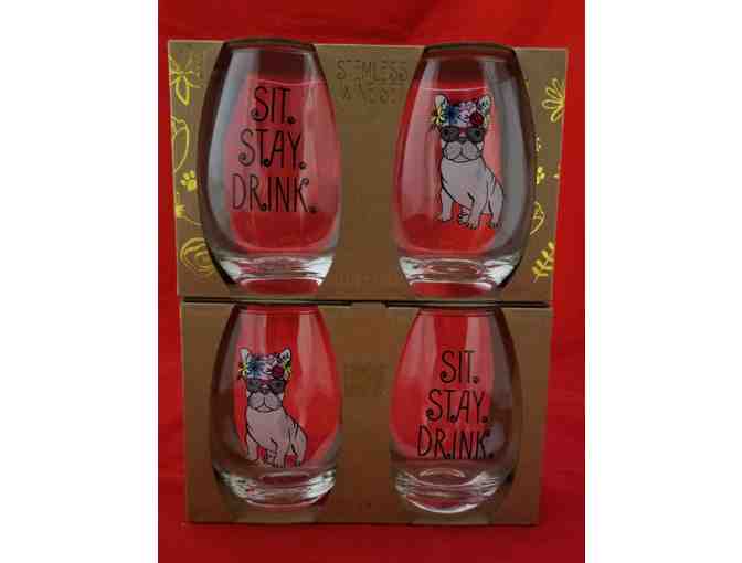Perfect for dog and wine lovers out there! These four stemless wine glasses have less chance of being knocked over with a wagging tail than a traditional stemmed glass. Two glasses say “Sit, Stay, Drink” with small dog prints and the other two glasses feature a white French bulldog sitting in red sunglasses wearing a halo of flowers around her head. Each stemless glass holds 22oz. of your favorite wine so “Sit, Stay, Drink” and relax!