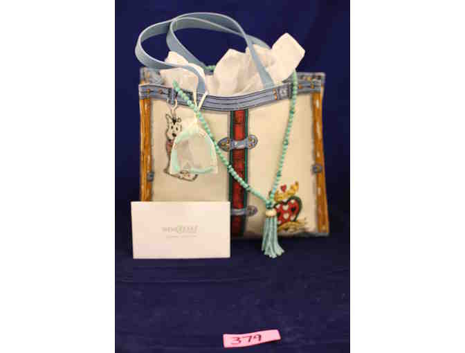 This item also consists of a roomy canvas Brighton tote printed with cute designer bag hardware (such as an adorable dog luggage tag) in red, green, yellow and blue. This tote has two sky blue leather handles and trim. As if that's not enough... you also receive a simulated turquoise and silver stretch bracelet and a necklace of similar, like colored, turquoise beads. These beads have a 14 inch drop before ending in a slinky tassel of smaller turquoise beads. The necklace is slightly adjustable with a two-inch chain including a lobster claw clasp.