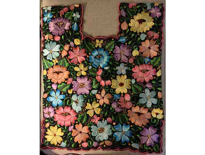 Embroidered front and back BLOUSE by artisans in Yucatan, Mexico. Vibrant-colored flowers from the deep, dark yellow, light blue, pink, and vibrant green, to the sunny orange, all of the colors are bright and full of life, black background. The result is this unique, elegant and Original piece of art. The material is soft and comfortable. Size: M