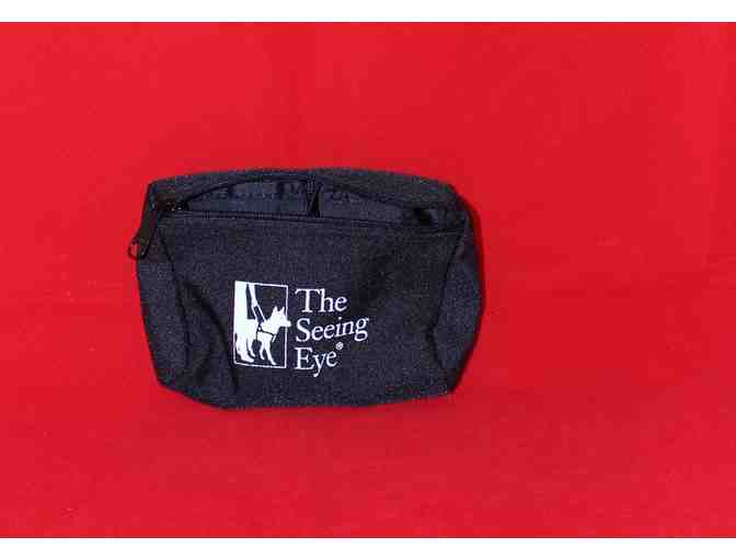 The Seeing Eye's zippered harness pouch by Roughwear is perfect for carrying pick up bags, your dogs gentle leader and even a small folding water bowl! The inner pocket of this black, water resistant pouch is great for storing flat objects such as your Seeing Eye identification card, ATM or credit cards, paper money or a hotel key card. The Seeing Eye is displayed in bold white print on the front of the pouch and two quick release clips fasten the lightweight pouch on the chest or back strap of your dog's harness.