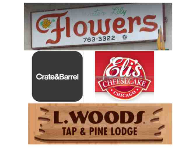 $50 GC Waterlily Flowers,$100 GC L.Woods Tap & Pine Lodge ,$25 GC Crate & Barrel, $20 Eli's Cheesecake