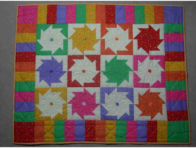 Good for a crib, this quilt is bright and fun. Each block has a fleece center for texture.