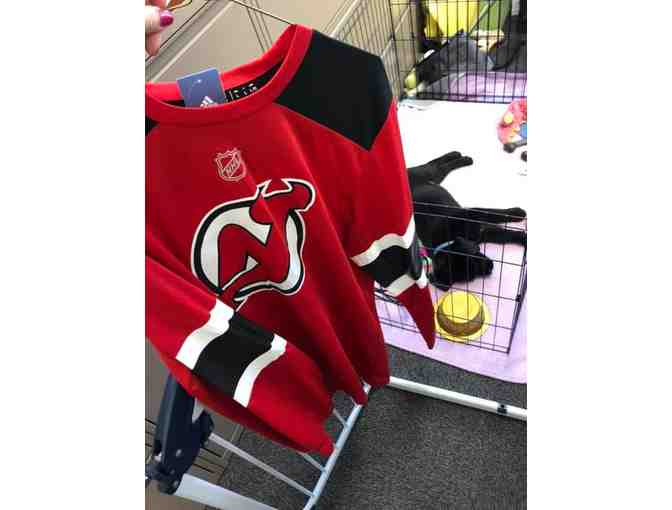 Devils fans- here it is! Support your team wearing this NHL Devils long-sleeved tee-shirt in men’s size large. Red, of course, with black and white Devil’s insignia on the front, black and white stripes on the sleeves and at the shoulders. Wear it at the games, wear it on the weekends- you’re going to look like a pro wherever you go in this fabulous shirt. Go Devils!