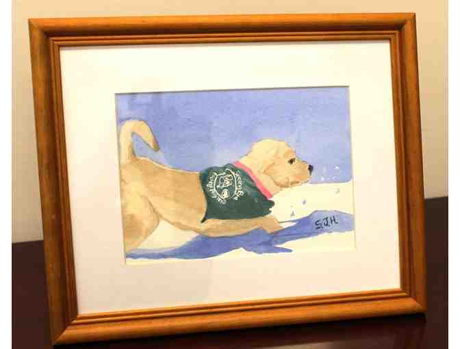 This watercolor of a Seeing Eye yellow Labrador puppy playing in his first snowfall will bring a smile to all dog lovers. The yellow lab is in digging in the snow with his front paws down wearing a Seeing Eye puppy raising bandana. The 5" x 7" watercolor is matted to 8" x 10" with light brown wooden frame
